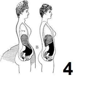 Показывает нам влияние корсета, столь популярного ранее, на анатомию внутренних органов живота и таза. Видно, что тонкая талия достигалась за счет проталкивания органов вниз, что давало выпирающий низ живота, отечный лобок и обвисшие ягодицы, красиво прикрытые турнюром (пышной юбкой с большим количеством складок). Понятно, что влияние эластичного пояса гораздо более мягкое, но по смыслу такое же. Заставляет задуматься, не так ли?